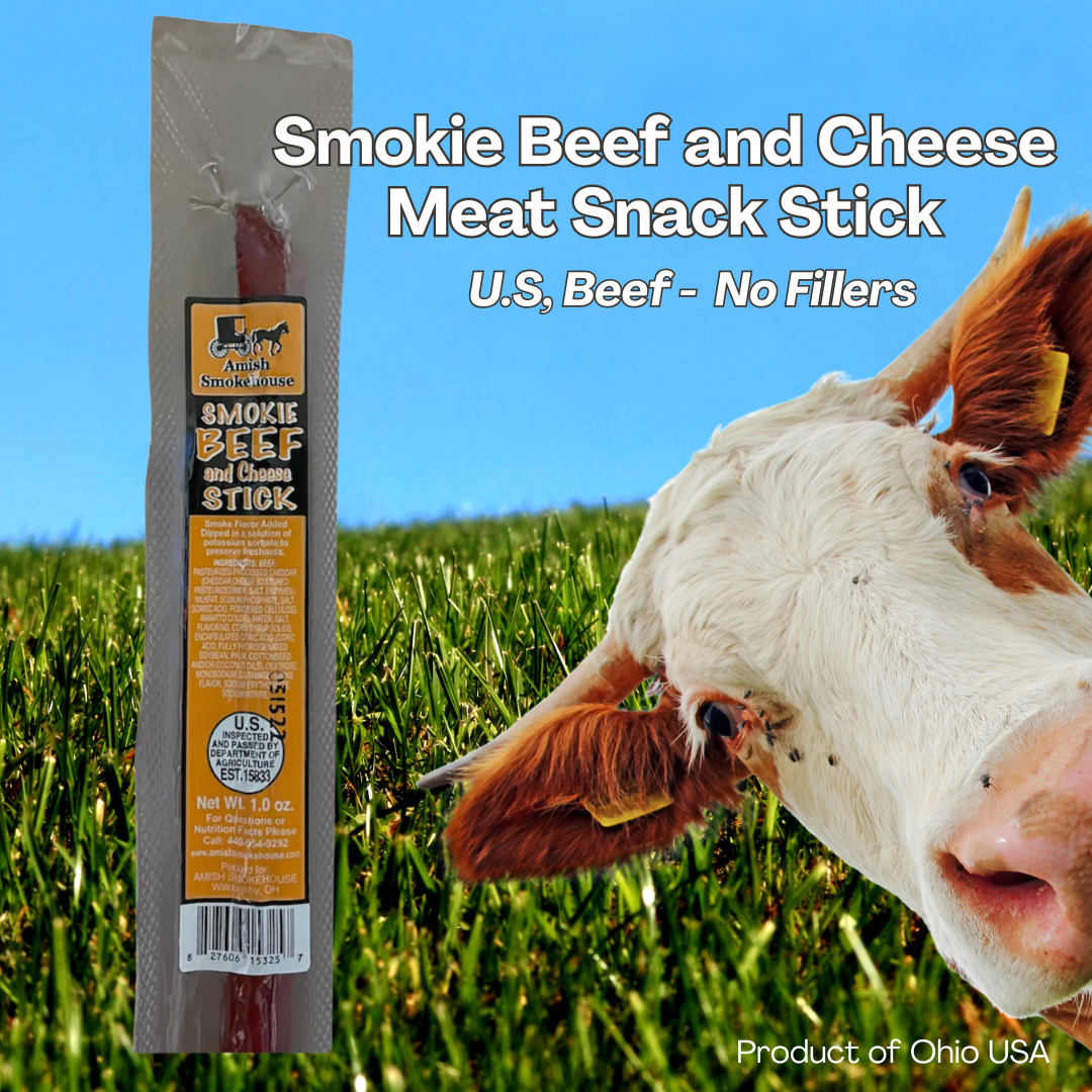 Get ready for a flavor-packed bite with our Smokie Beef and Cheese Meat Snack Stick, made from 100% pure US beef without any fillers. This deliciously savory snack adds a fun kick, perfect for munching anytime you want! Made in Ohio USA.